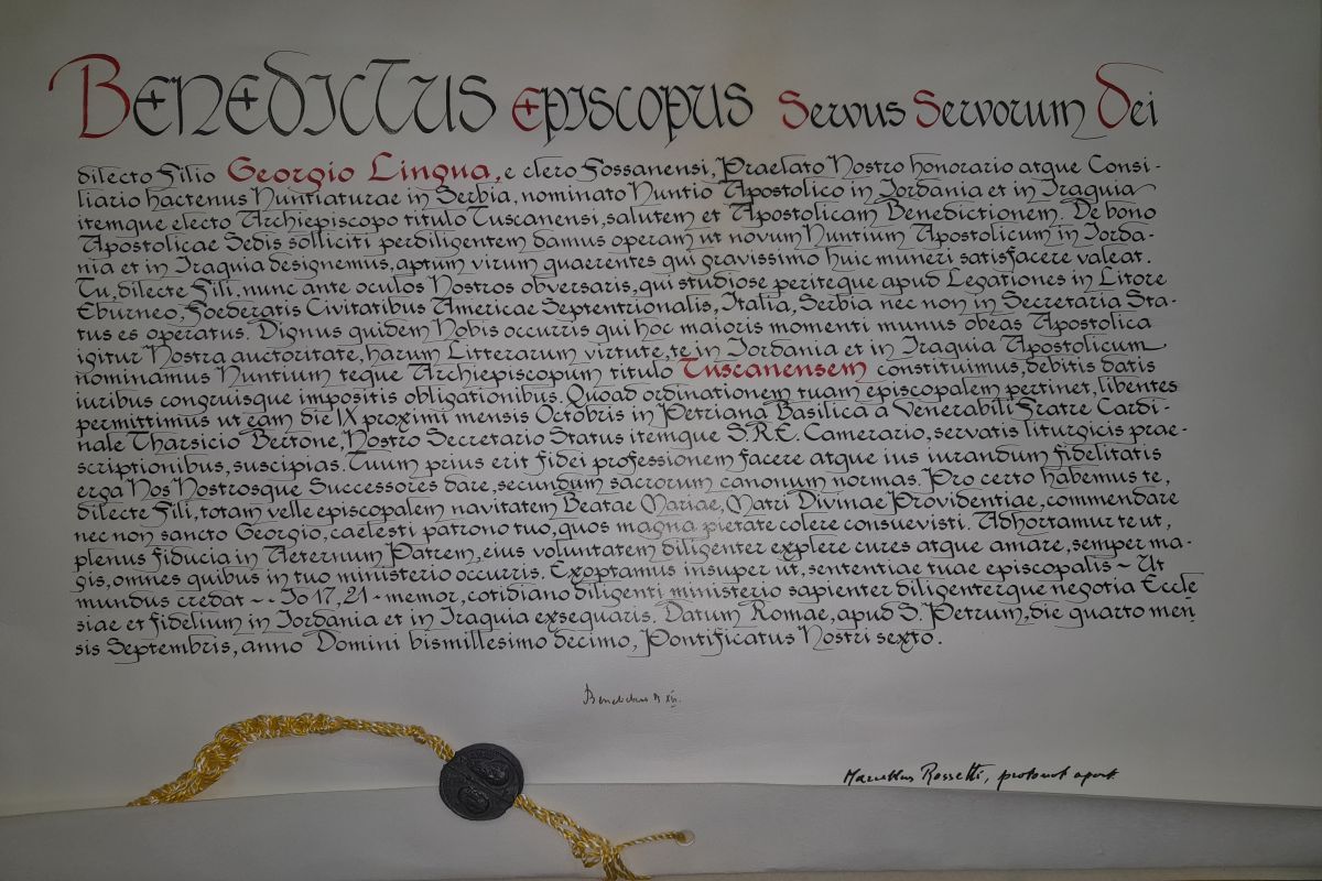 Dana 4. rujna 2010. godine pokojni papa u miru Benedikt XVI. imenovao je naslovnim nadbiskupom Tuscanije i apostolskim nuncijem u Iraku i Jordanu talijanskoga svećenika Giorgija Linguu, sadašnjega apostolskoga nuncija u Republici Hrvatskoj. Upitan o svojim sjećanjima na pokojnoga papu u miru, nadbiskup Lingua za Glas Koncila odgovara: „Nisam izravno upoznao pokojnika niti kao kardinala niti kao papu.“